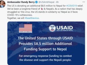 आज अपराह्न ट्विट गर्दै उनले अमेरिकाको पुरानो मित्र नेपाललाई महामारीविरुद्धको लडाइँमा भरथेग गर्न अन्तरराष्ट्रिय विकासका लागि अमेरिकी सहयोग नियोग (युएसएआइडी) मार्फत उक्त रकम उपलब्ध गराइने बताएका हुन् । “कोभिड–१९ विरुद्ध ठूलो सङ्घर्ष गरेको आफ्नो मुलुक नेपालप्रति ऐक्यबद्धता प्रकट गर्दछ, निर्दयी कोरोनालाई परास्त गर्न नेपाल सफल हुनेछ”, उनको ट्विटमा भनिएको छ ।