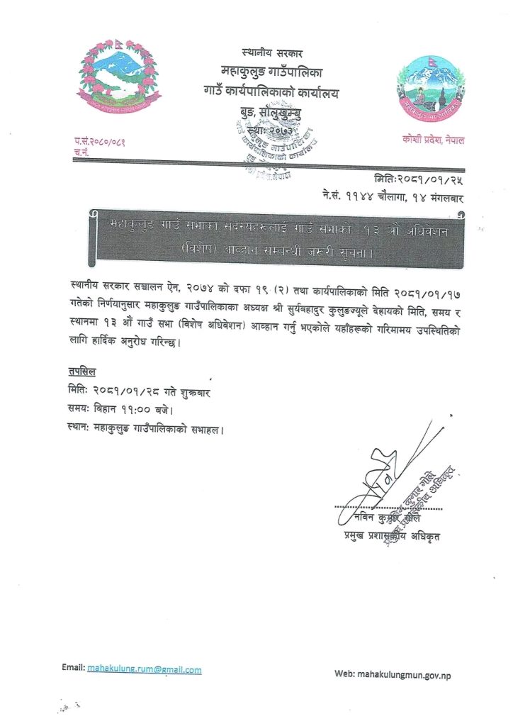 गाउँ सभाको १३ औं अधिवेशन (विशेष) आव्हान सम्बन्धी सूचना । दाक्सु मिडिया | २०८१ बैशाख २५ थप समाचारहरु अदुवा खेति कार्यक्रमको प्रस्ताव आव्हान सम्बन्धी सूचना । साउन २७ गते बुधबार बैठक बस्ने गरी लुम्बिनी प्रदेश सभाको विशेष अधिवेशन आह्वान सोलुदुधकुण्ड नगरपालिकाको बोलपत्र आव्हान गरेको सम्बन्धि सूचना । कृषकहरुबाट चियाको विरुवाको माग संकलन सम्बन्धी सूचना । व्यवसाय दर्ता तथा नविकरण शिविर सञ्चालन सम्बन्धी सूचना । व्यवसाय दर्ता शिविर स्थगित भएकाे सम्बन्धी सूचना । तपाईको प्रतिक्रिया दिनुहोस् Leave a Reply Cancel replyYour email address will not be published. Required fields are marked * Your Comment* Name* Email* Website Notify me of follow-up comments by email. Notify me of new posts by email. Δ