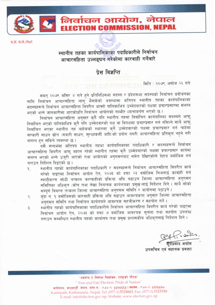 तर, निर्वाचन आचारसंहिता उल्लंघन गरी चुनाव प्रचारप्रसारमा स्थानीय तहका पदाधिकारी लागेको पाइएमा कारबाही गरिने उल्लेख गरिएको छ |