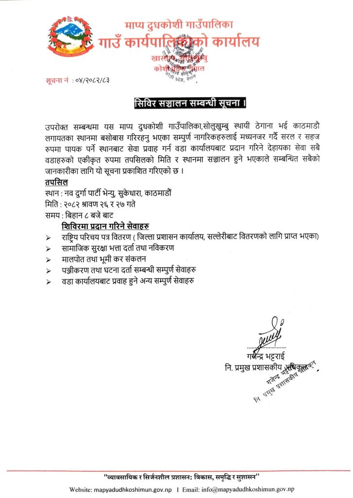 सोलुखुम्बु, श्रावण २ – माप्य दुधकोशी गाउँपालिकाले काठमाडौंमा बसोबास गरिरहेका आफ्ना स्थायी बासिन्दालाई लक्षित गर्दै विशेष सेवा शिविर सञ्चालन गर्ने भएको छ।