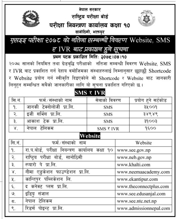 रिजल्ट प्रकाशित भएपछि वेबसाइट, एसएमएस र आइभीआरबाट हेर्न सकिने राष्ट्रिय परीक्षा बोर्डअन्तर्गत परीक्षा नियन्त्रण कार्यालय सानोठिमीले बताएको छ।